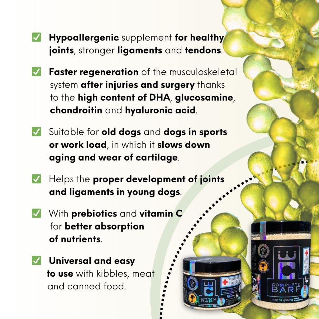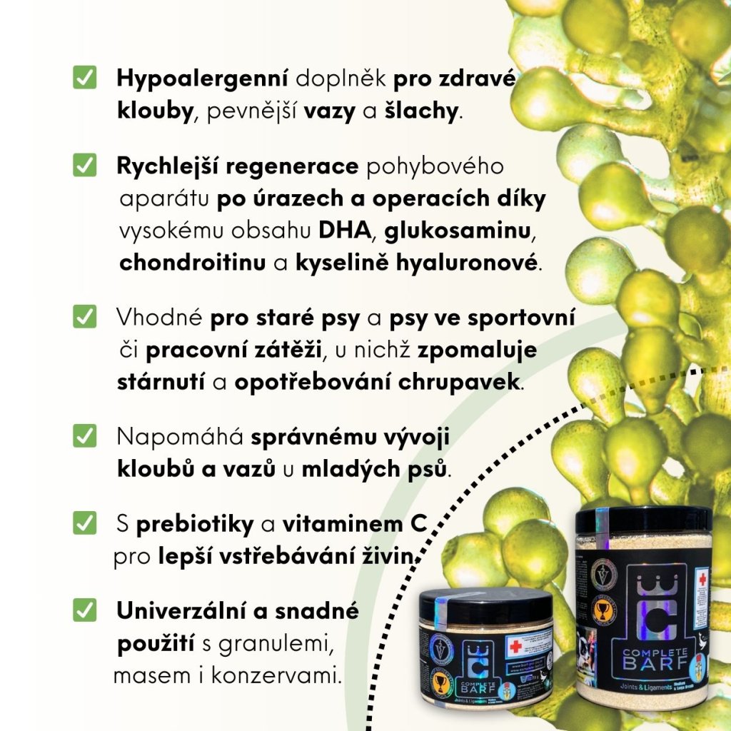 Complete BARF Klouby a vazy pro střední a velká plemena Podpora správného vývoje kloubů, vazů a šlach - Zpomaluje stárnutí a opotřebování chrupavek - Rychlejší regenerace po úrazech a operacích
