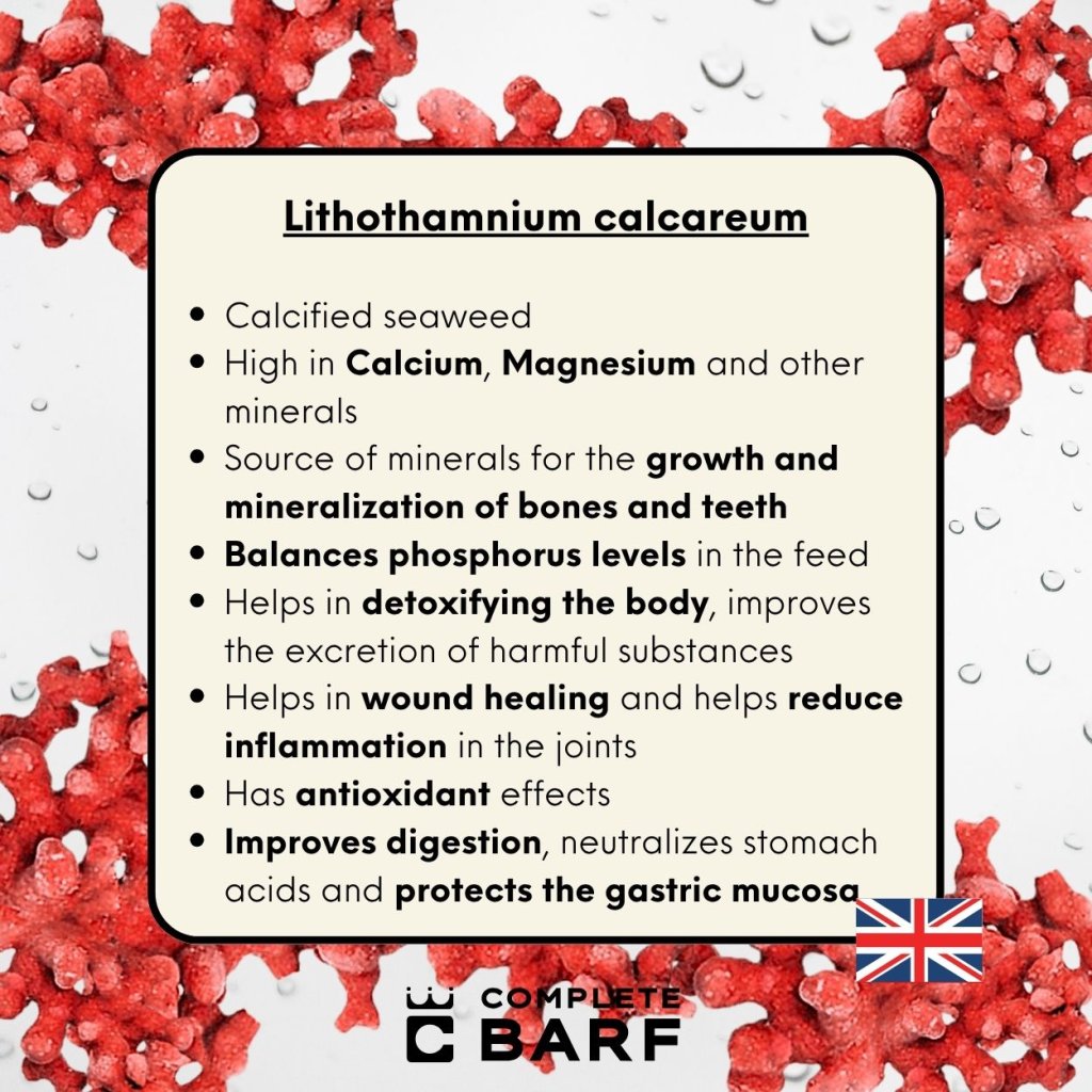 Poskytuje vysoce vstřebatelný vápník pro psa z prémiového přírodního zdroje – mořské řasy Lithothamnium calcareum. Je ideální volbou pro všechny, kteří se obávají zkrmování skutečných kostí, a pomáhá vyrovnat nadbytek fosforu v bezkosté svalovině.