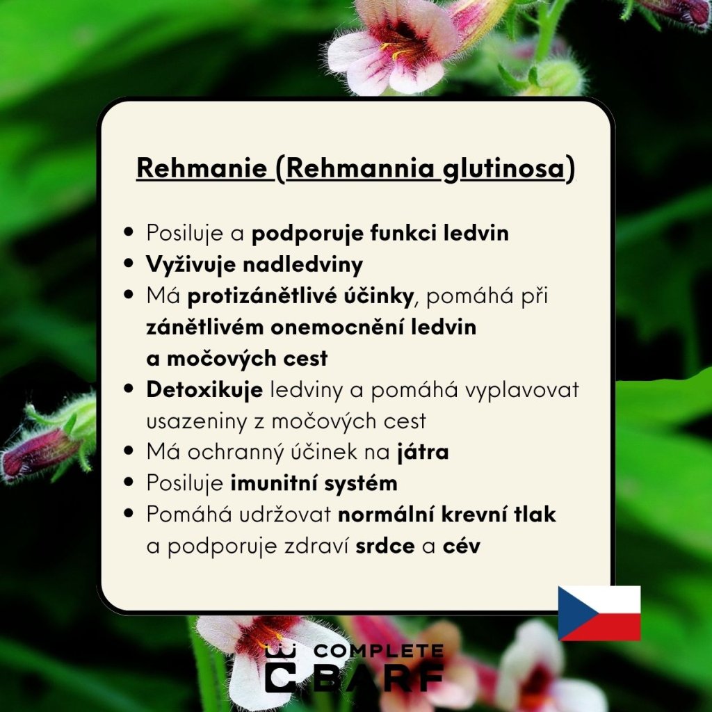 Osvědčená kombinace bylin jako kozinec a rehmanie podporuje přirozenou regeneraci ledvinové tkáně a správnou cirkulaci krve. Tyto bylinky spolu s kurkumou navíc pomáhají bojovat s častým nechutenstvím u psa a navracejí mu chuť k jídlu.
