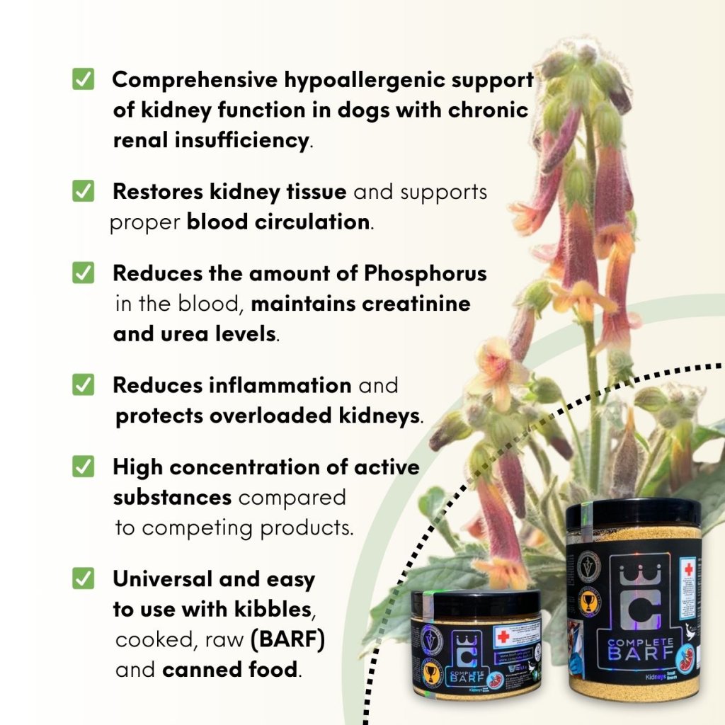 - Jako jeden z nejkomplexnějších doplňků stravy pro psy zaměřených na zdraví ledvin.