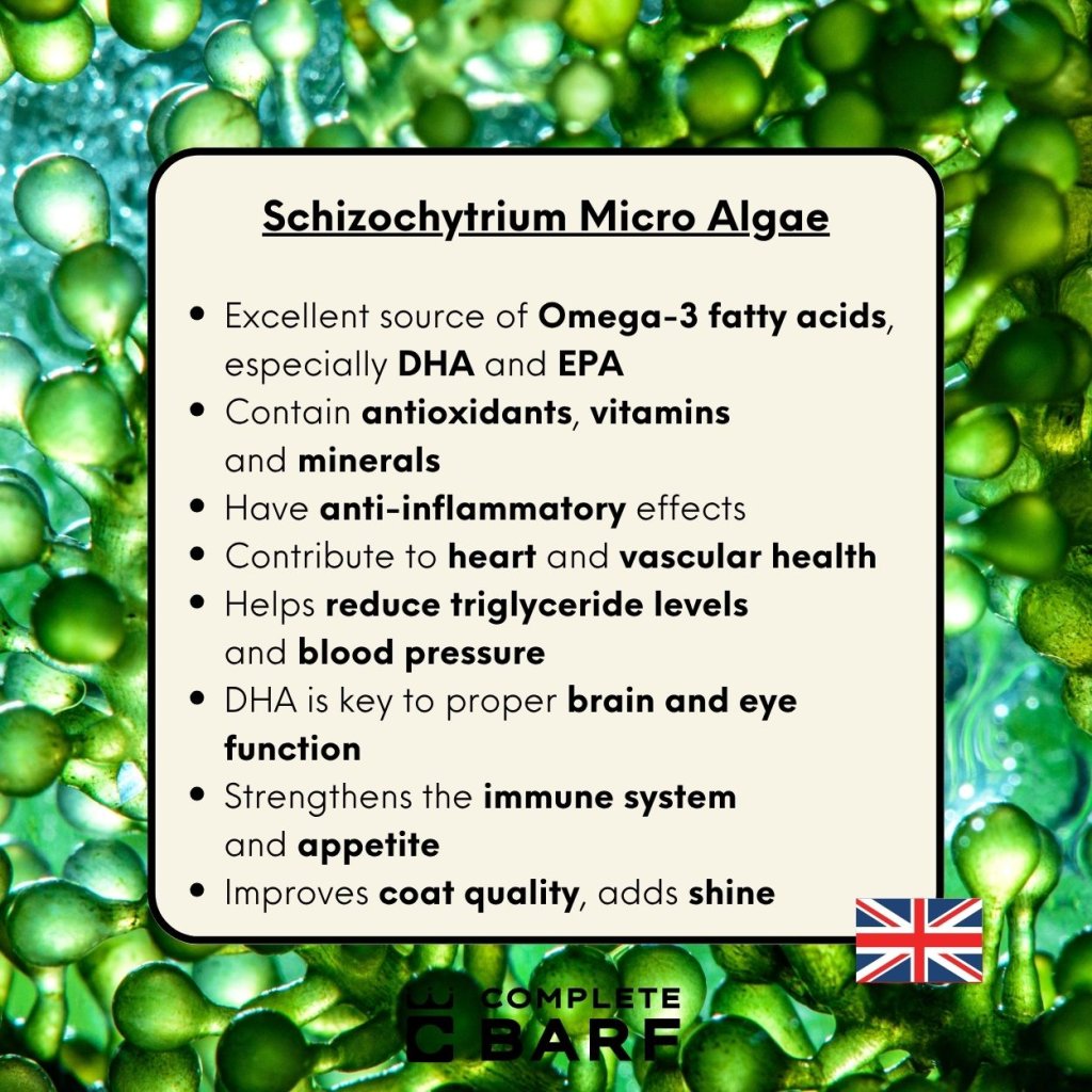 Hrubý protein 26,4 %, hrubá vláknina 24,9 %, hrubý tuk 14,7 %, hrubé sacharidy 13,3 %, hrubý popel 5,2 %, energetická hodnota 348 kcal/100 g, DHA 3 600 mg/100 g, kyselina hyaluronová 150 mg/100 g.