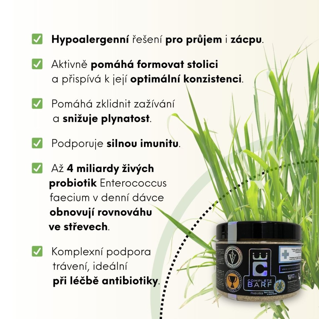 Směs travin, psyllium, jablečná vláknina, probiotická kultura Enterococcus faecium <1%